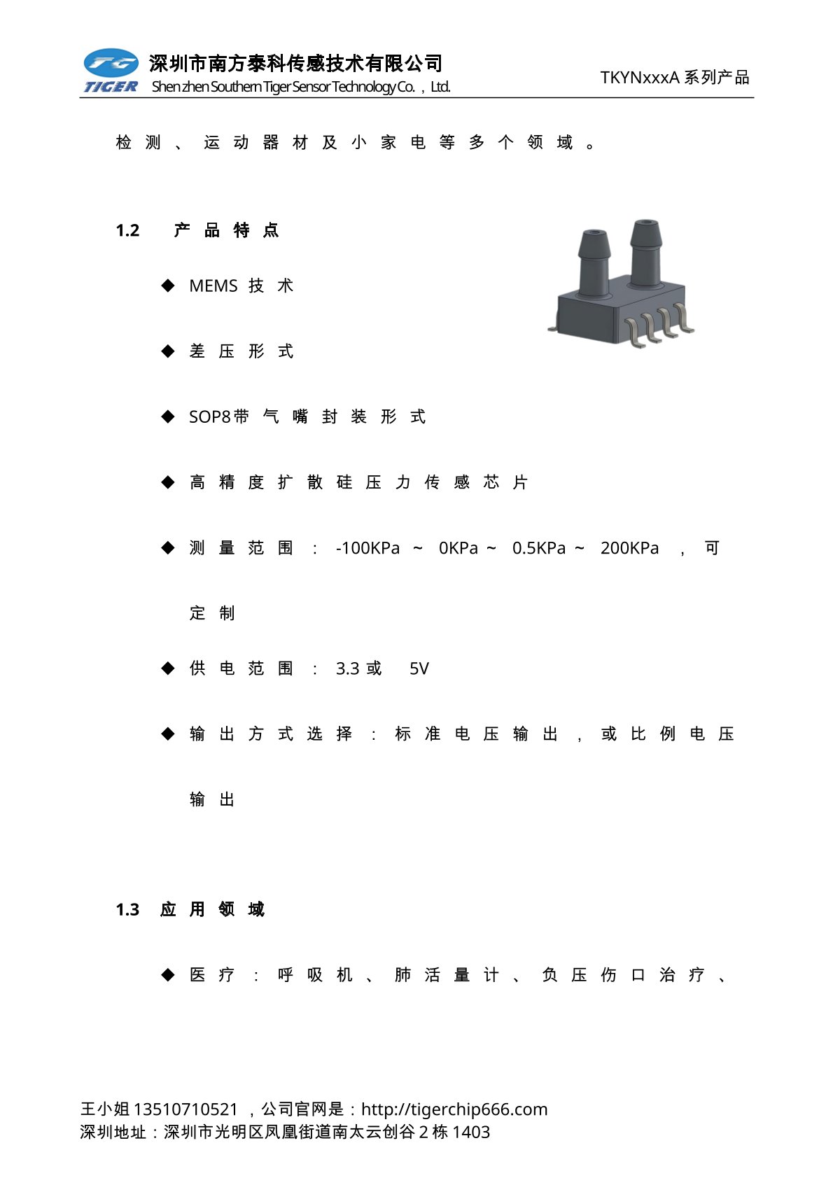 1.2产品特点 MEMS技术 表压形式 SOP8带气嘴封装形式 防潮和防油 高精度扩散硅压力传感芯片 测量范围:-100KPa~0KPa~5KPa~700KPa,可定制 供电范围:3.0~5.5V 输出方式选择:标准电压输出,或比例电压输出