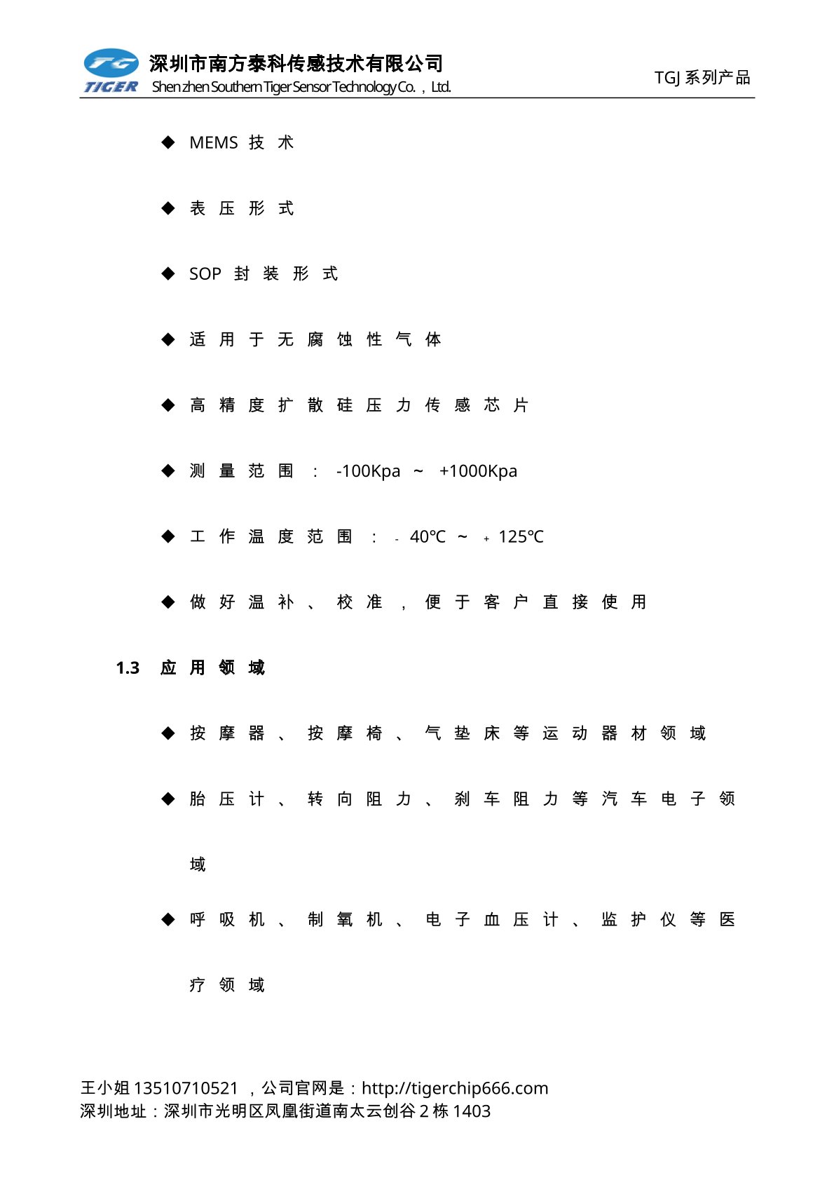1.2产品特点 MEMS技术 表压形式 SOP8带气嘴封装形式 防潮和防油 高精度扩散硅压力传感芯片 测量范围:-100KPa~0KPa~5KPa~700KPa,可定制 供电范围:3.0~5.5V 输出方式选择:标准电压输出,或比例电压输出